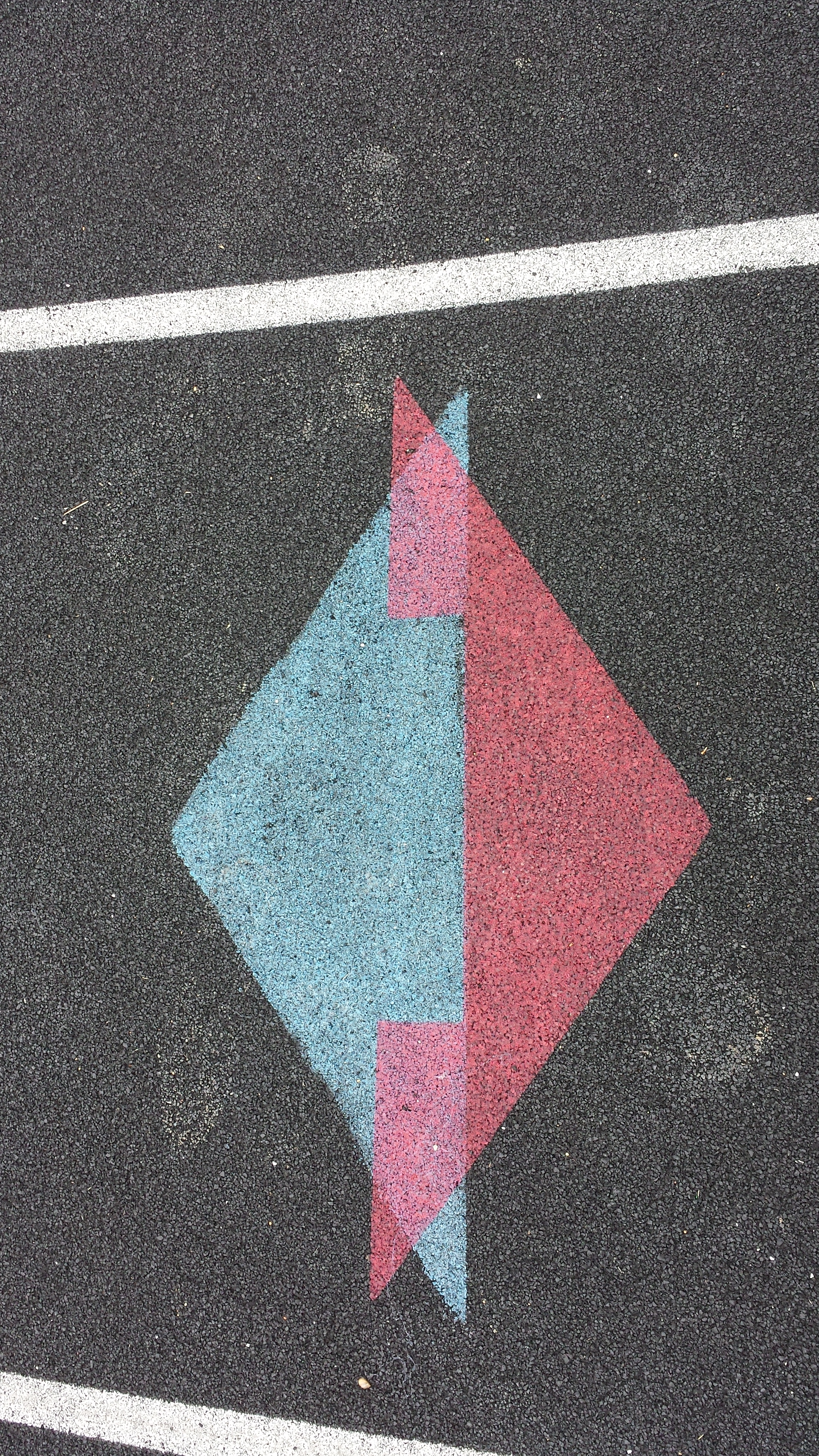 This falls into subjective, so not very interesting to anyone but me. Still, I want to write, and write about it I will. Last week, the word “Merkabah” was swirling around my head a lot. In the Temple of the Heart on the astral plane, I saw the blue entity on the right side of the room pointing at the other side of the room where usually I see the golden beings. This time I saw a jumble of golden energy and understood from the blue being that I was to make a merkabah out of the energy that was there. I didn’t know how to do this and thought it would be complicated because I get lost in visualizing all the triangles and pyramids, etc. I looked up a picture online to see what they look like. Then once I could see the whole thing, I was able to just create one and then see myself inside of it. Once I had the whole thing together I could then inspect and see every part. A day later I heard the name Merkabah from David Wilcock’s talk and I researched it a little more online and learned all about these rotations at various different rates and it sounded complicated. I sort of stopped the movement a little for a couple of days. Then on Sat, last week, I was running on the high school track and asked in the name of Jesus for a sign if I needed to pursue the Merkabah thing. I continued running around and then looked down and saw the attached picture on the track itself. After I took the picture, I looked for other “merkabah’s” on the track and this was indeed the only one. I’m not sure yet what to do with the Merkabah, but I’ll wait on more internal instruction. I have no doubt that the Merkabah is important in both the personal as well as cosmic sense.
