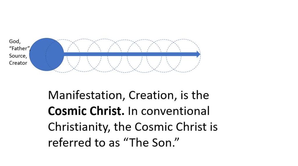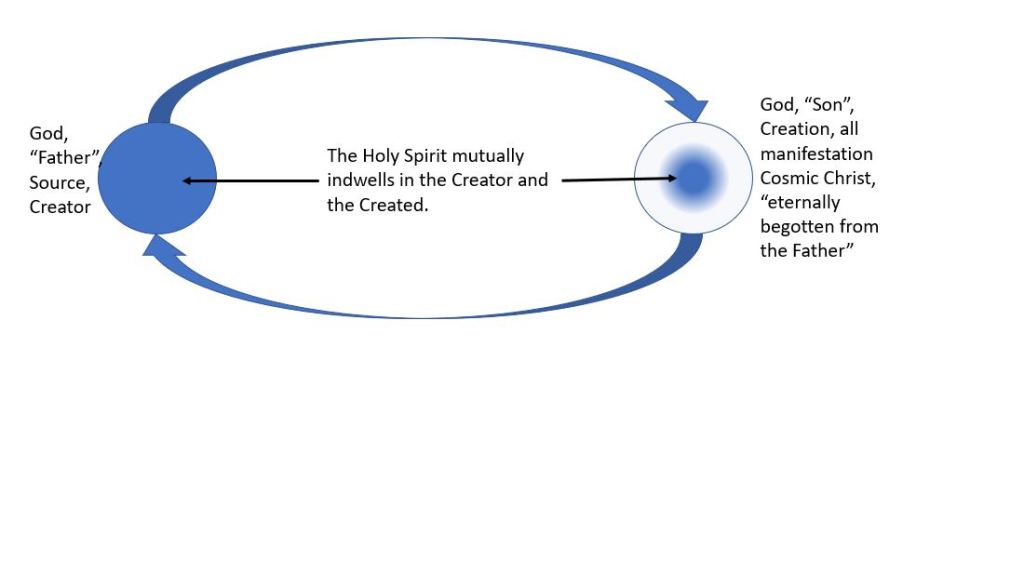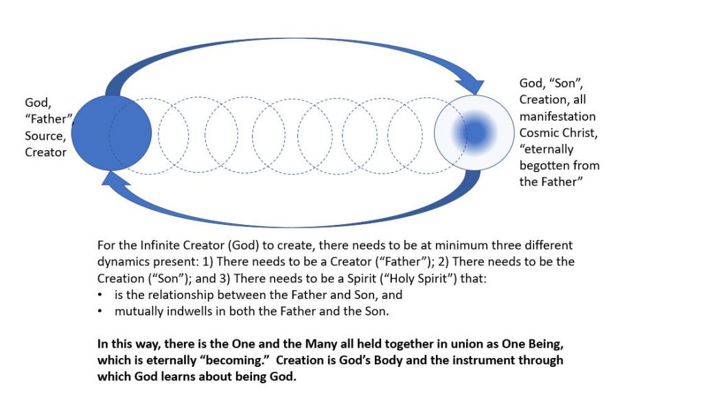 The Christian notion of the Trinity is simply the “formula” or “pattern” that must exist in order for there to be creation. The following is my attempt to graph this out in simplistic ways. Don’t get caught up in the words, especially “Father” or “Son” but rather, notice the ungirding dynamic at play. The interplay of Three is how God experiences Godself through manifestation. The early Christian church called this interplay, the Divine Circle Dance (“Perichoresis”). Not a bad spiritual intuition for people living almost 1700 years ago. Not bad at all!