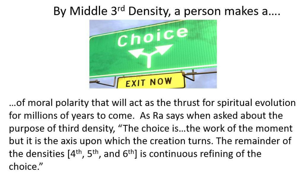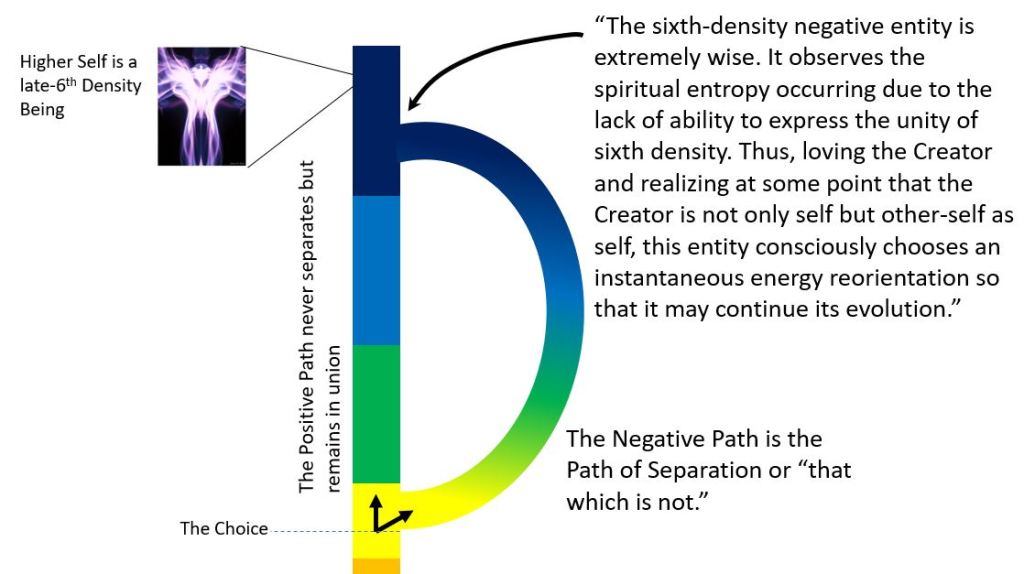 One of the primary results of the veil of forgetting is the Choice. There are two paths to spiritual development: the positive polarity and the negative polarity. Both act as catalysts for each other. Through free will, a person chooses one of these polarities that will provide the thrust for their spiritual evolution for millions of years. The following is taken from a section of my article on the Law of One (linked above):