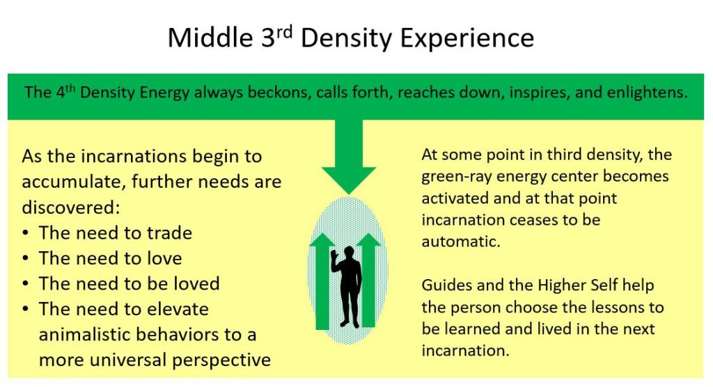 Thus, as third density progresses, a human begins to live from a more “green-ray” perspective, or wholeheartedness. This would be the beginning of living out the Law of One in an intentional manner. Who knows how many third-density incarnations need to occur before someone gets to the level where they live from a more universal perspective?