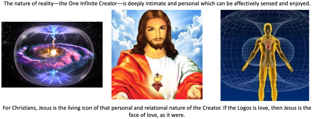 Jesus as iconic provides a living example of not only how to live (as a servant leader that heals, loves, and empowers the broken), but also reveals the deepest nature of the Infinite Creator, Itself. What is this nature? Love desires consummation through merging; and merging requires dying, surrender, and a willingness to be used by Love as channels for Love’s own eternal creative expression.