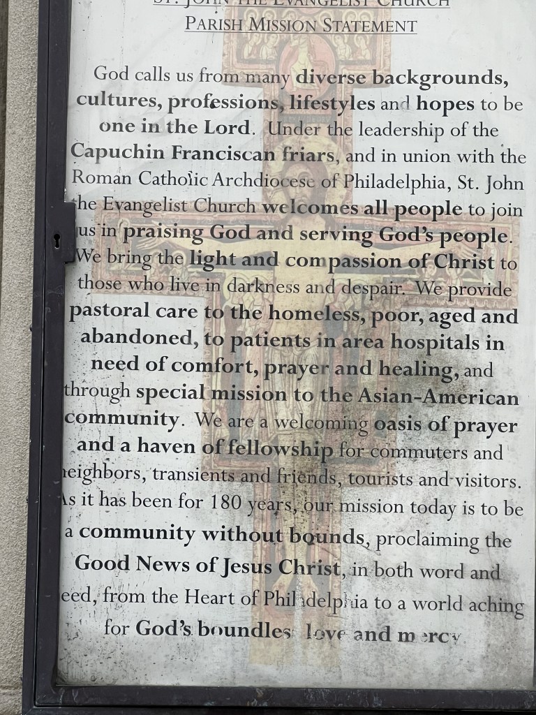 If you’ll forgive my over-posting here, I just attended Mass at a church located down the block of our hotel in Philly. It’s run by the (Capuchin) Franciscans, believe it or not. I took 3 pictures of the outside of the church after Mass which speak to me of the Law of One. See what you think?