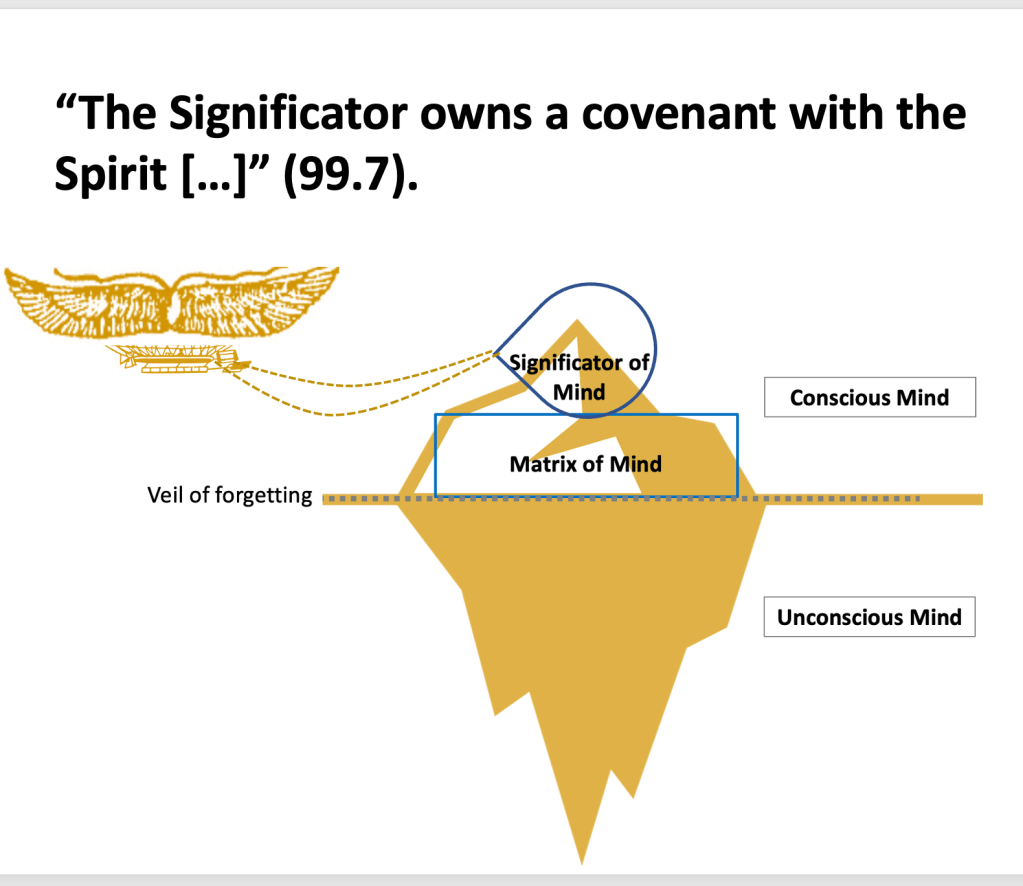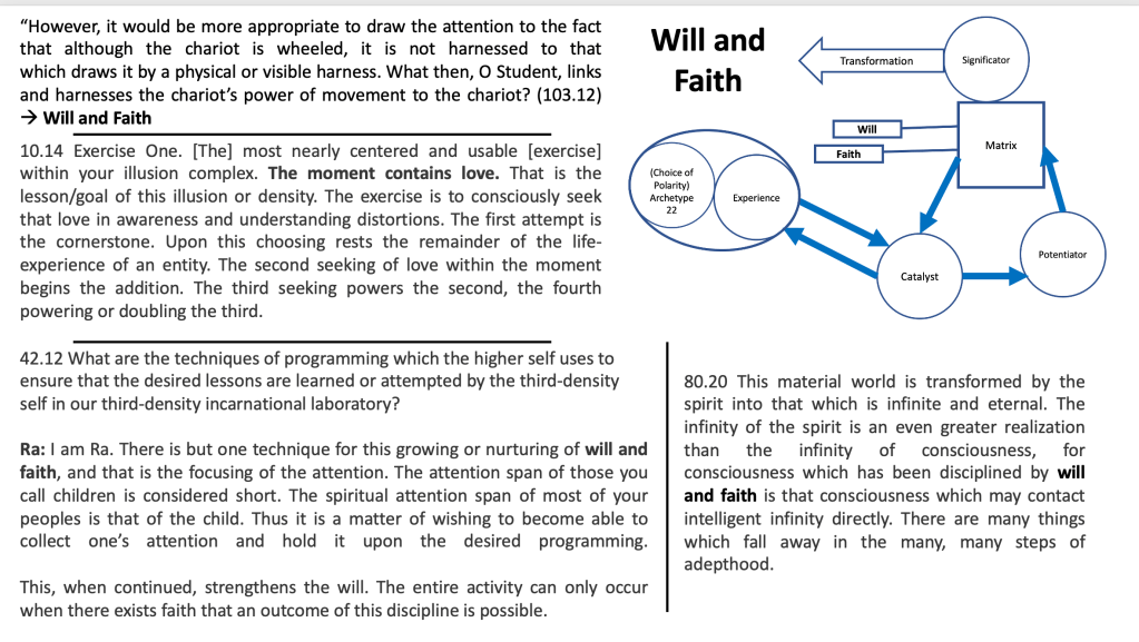 “However, it would be more appropriate to draw the attention to the fact that although the chariot is wheeled, it is not harnessed to that which draws it by a physical or visible harness. What then, O Student, links and harnesses the chariot’s power of movement to the chariot? (103.12) –> Will and Faith