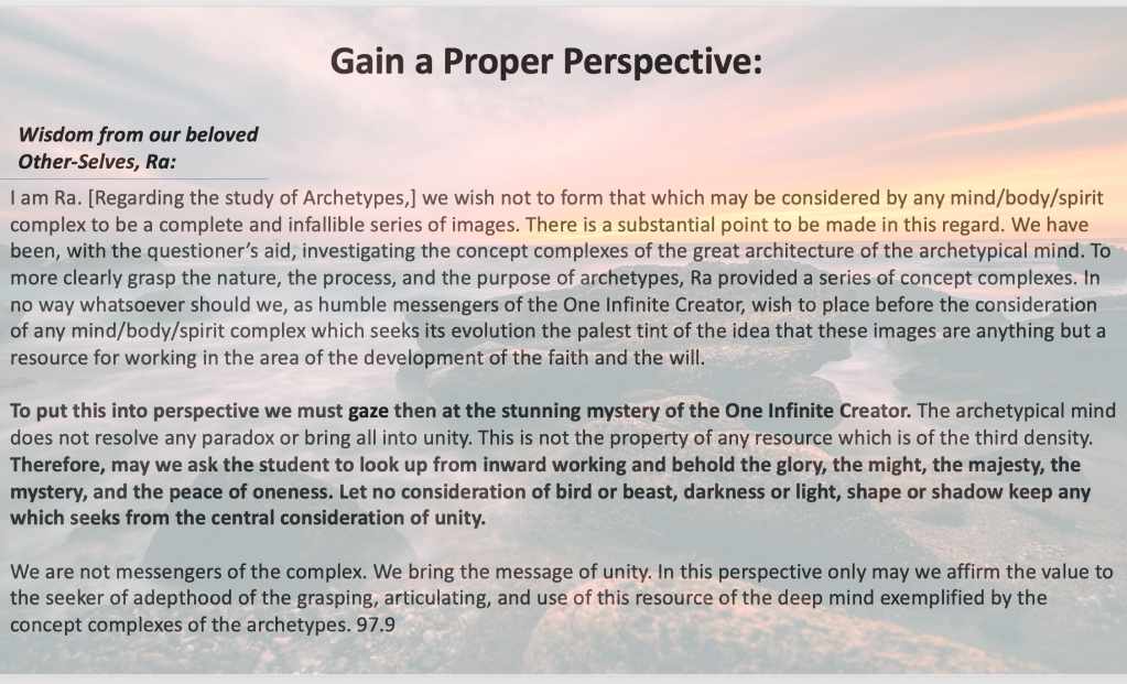 I am Ra. [Regarding the study of Archetypes,] we wish not to form that which may be considered by any mind/body/spirit complex to be a complete and infallible series of images. There is a substantial point to be made in this regard. We have been, with the questioner’s aid, investigating the concept complexes of the great architecture of the archetypical mind. To more clearly grasp the nature, the process, and the purpose of archetypes, Ra provided a series of concept complexes. In no way whatsoever should we, as humble messengers of the One Infinite Creator, wish to place before the consideration of any mind/body/spirit complex which seeks its evolution the palest tint of the idea that these images are anything but a resource for working in the area of the development of the faith and the will.