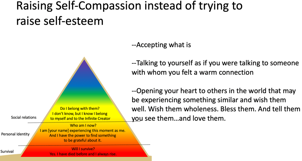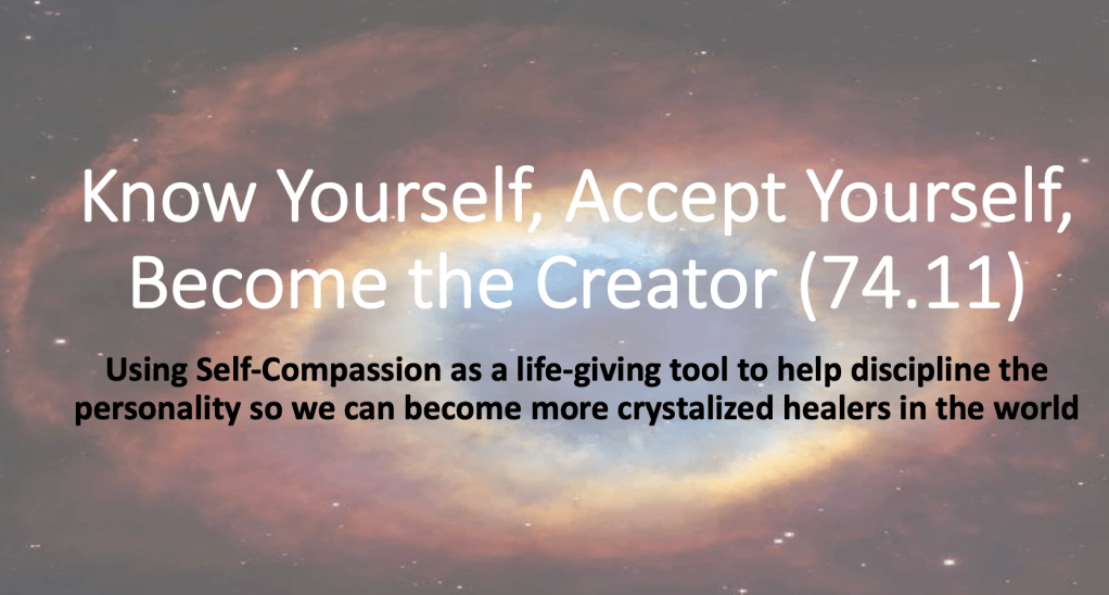 So many of us experience low-self esteem. Even if we are well-versed in some sort of nondual spirituality, the reality of unitive consciousness with the Creator may not often be an experiential gnosis we enjoy. In this presentation, we discuss the blockages in the lower three chakras and how they often present in our daily lives. Here, we will add that the road to higher self-esteem is self-compassion. Through this medium, the lower chakras and the high chakras meet in the heart. The presentation utilizes wisdom from the Law of One and teaching from a pioneer in self-compassion studies, Dr. Kristen Neff: https://self-compassion.org