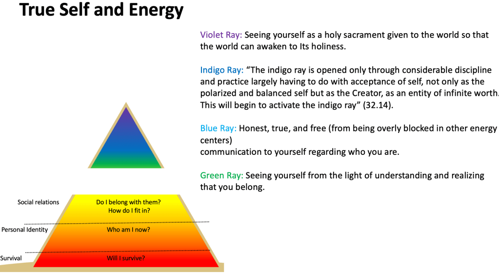 Indigo Ray: “The indigo ray is opened only through considerable discipline and practice largely having to do with acceptance of self, not only as the polarized and balanced self but as the Creator, as an entity of infinite worth. This will begin to activate the indigo ray” (32.14).