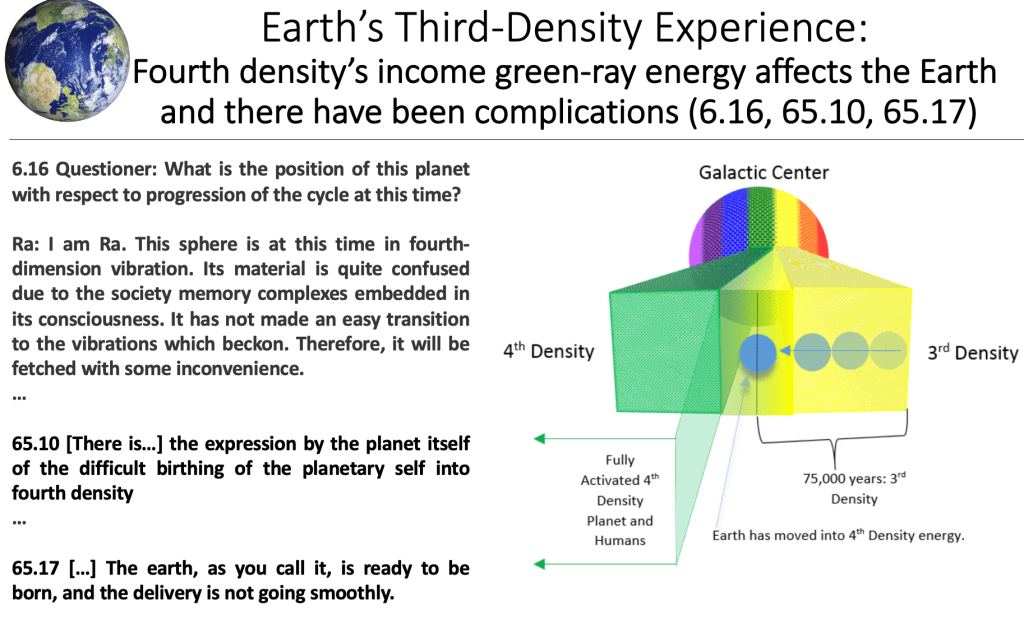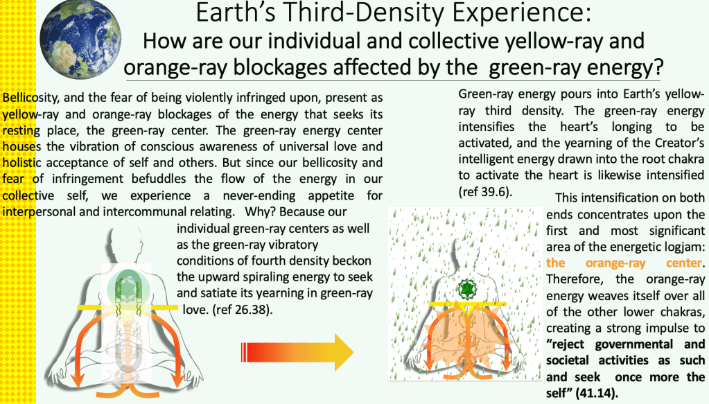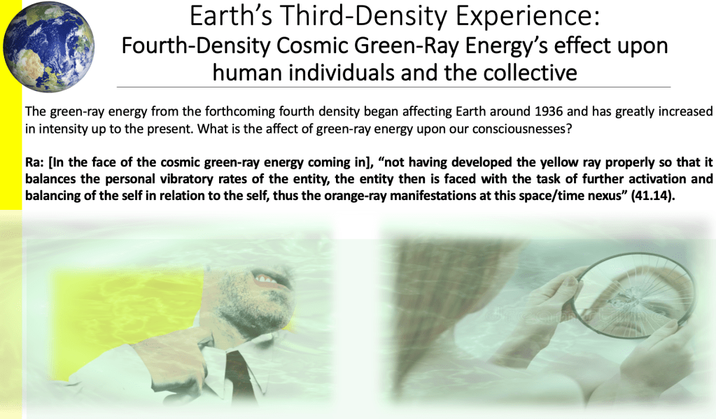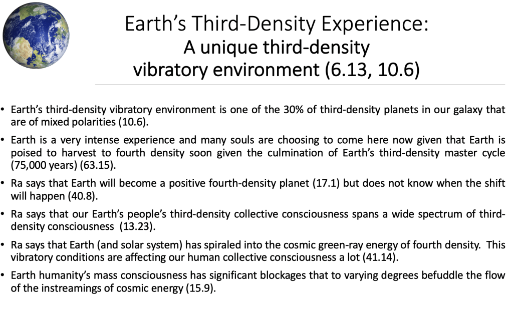 The Law of One is clear that the many people are here now to help midwife Earth’s fourth density vibratory conditions. The presentation pulls together Ra’s descriptions of the Earth’s third density. Ra’s balancing technique helps us learn how to become the Creator by balancing our inner lives as we become more aware of what arises given the catalysts of the day. Doug offers another type of technique that is based upon the Law of One and the techniques of self-compassion. He calls this the Sacrament of Solidarity. Participating in the Sacrament of Solidarity is a kind of tapping into Intelligent Infinity and the result can be an explosion of love, joy, perspective, and integrity. Inner balancing naturally ensues.