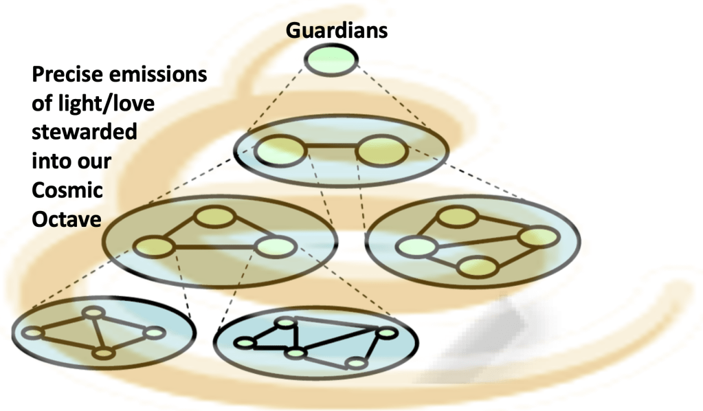 These Guardians steward precise amounts of love/light and light/love into our Octave, especially God’s third chakra, including Earth’s humanity, following some kind of crazy complicated cosmic-divine karmic algorithm.