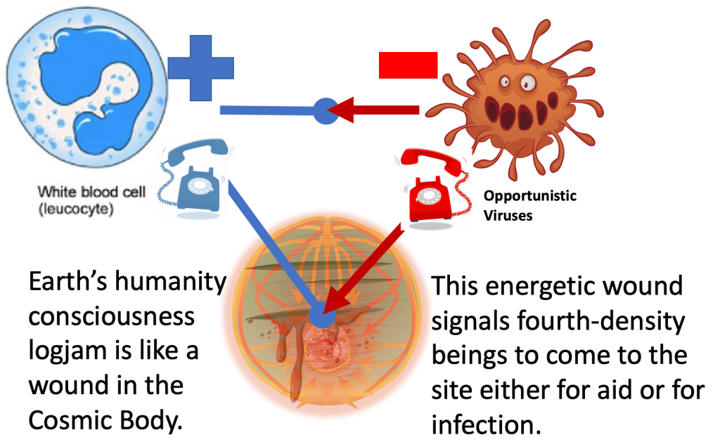 The experience would be too intense because a third-density operational system couldn’t handle the denser forth-density power upgrade. And as it stands, here at the tail end of Earth’s third density experience, our human collective unconscious has not polarized enough into green-ray consciousness on either the macro or micro levels. We are not ready for fourth-density lessons–even as Earth has fully entered into the fourth-density sector of our galaxy.
