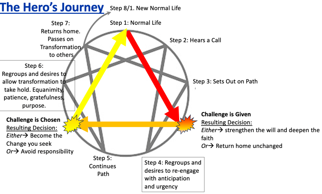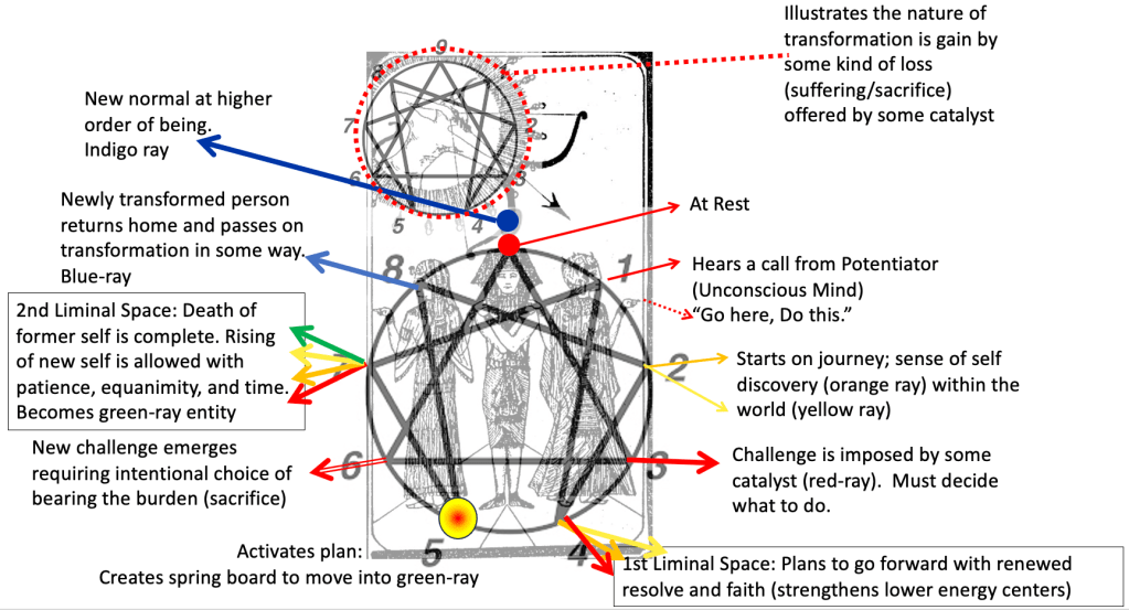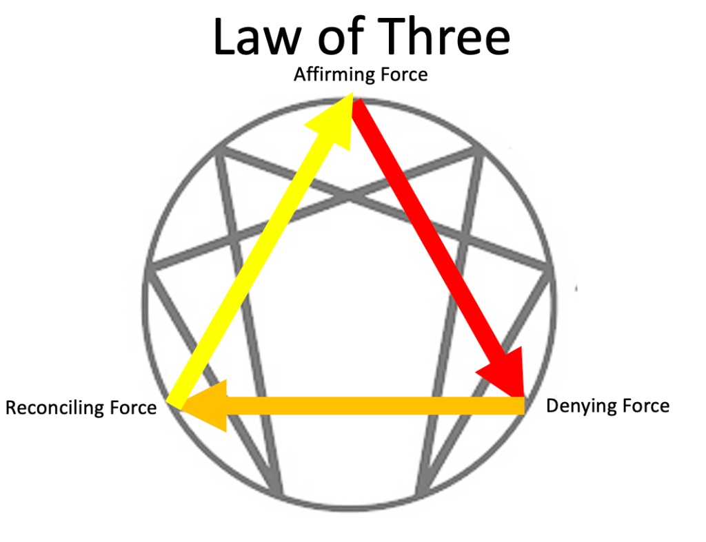 For those few who might be informed by Gurdjieff’s work on the Enneagram, especially the Law of Three and the Law of Octaves (Law of Seven),