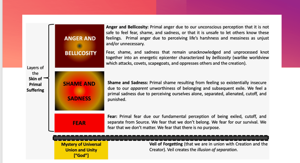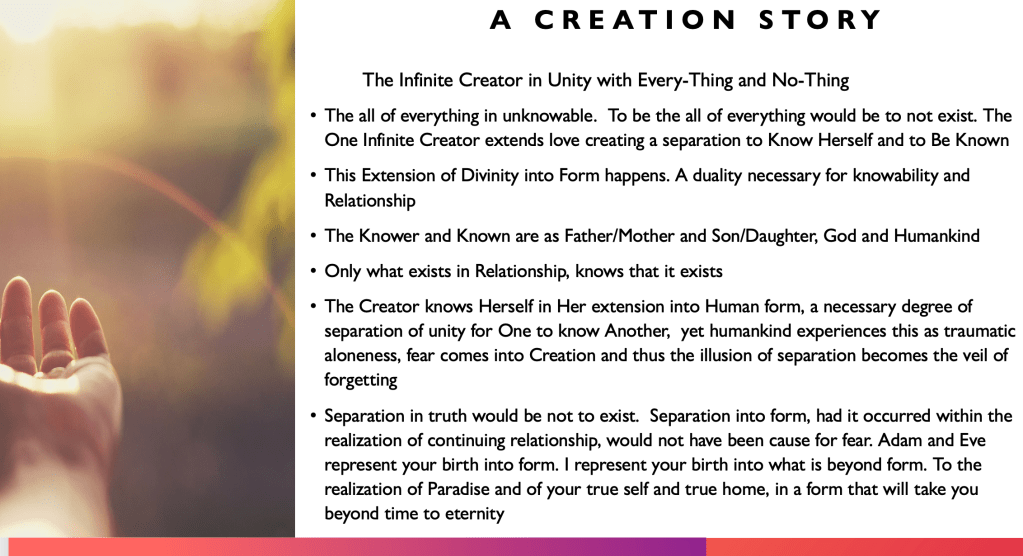separation of unity for One to know Another, yet humankind experiences this as traumatic aloneness, fear comes into Creation and thus the illusion of separation becomes the veil of forgetting