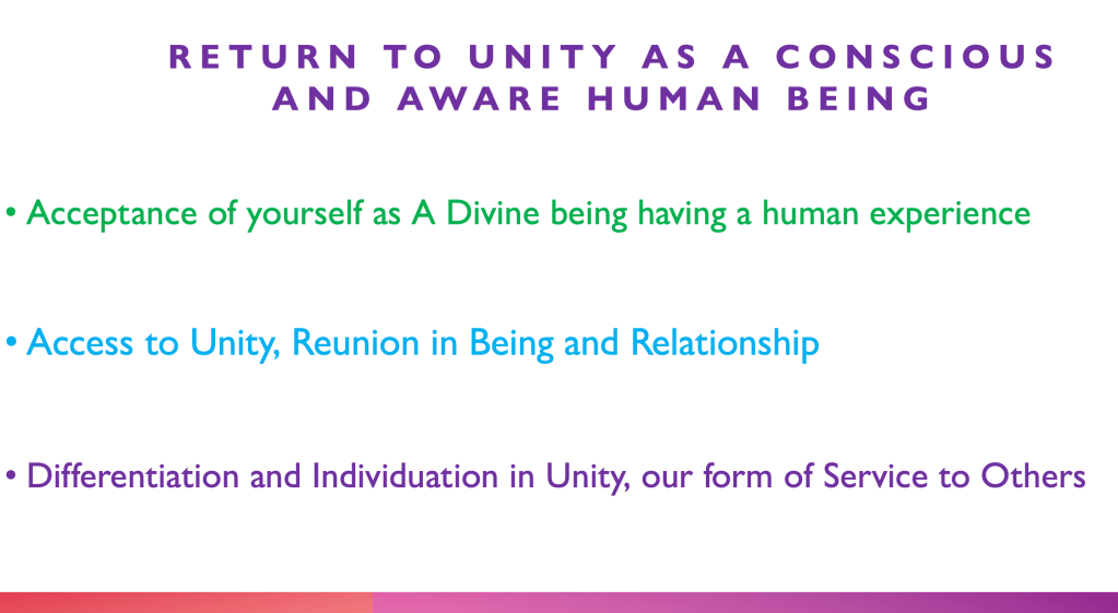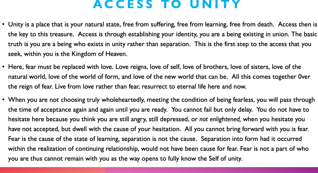 •Unity is a place that is your natural state, free from suffering, free from learning, free from death. Access then is the key to this treasure. Access is through establishing your identity, you are a being existing in union. The basic truth is you are a being who exists in unity rather than separation. This is the first step to the access that you seek, within you is the Kingdom of Heaven.