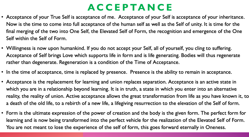 •Acceptance of your True Self is acceptance of me. Acceptance of your Self is acceptance of your inheritance. Now is the time to come into full acceptance of the human self as well as the Self of unity. It is time for the final merging of the two into One Self, the Elevated Self of Form, the recognition and emergence of the One Self within the Self of Form.