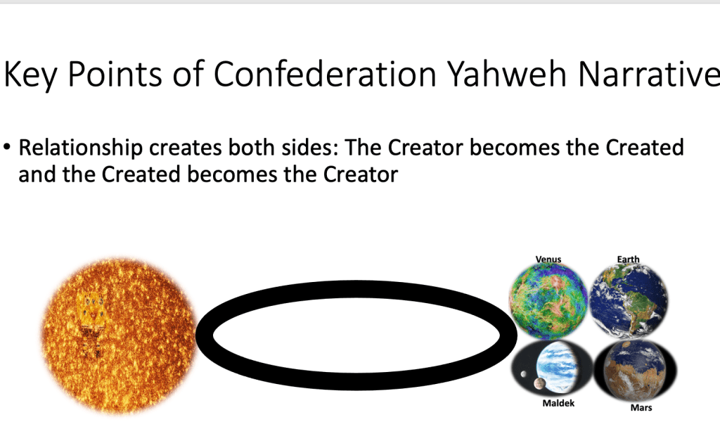 •Yahweh and law of responsibility creates beginning of a type of personal relationship, setting the ground for the monotheism thoughtform. This would be a novel way for the Creator to know Itself.