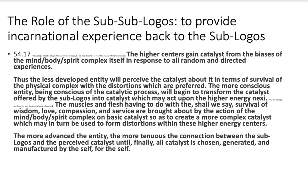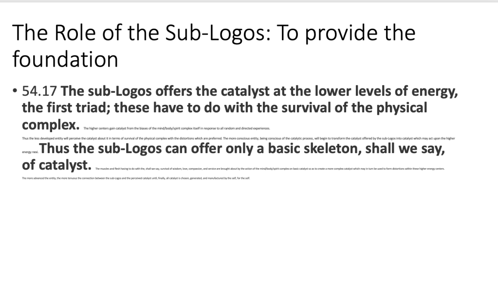 •54.17 The sub-Logos offers the catalyst at the lower levels of energy, the first triad; these have to do with the survival of the physical complex. The higher centers gain catalyst from the biases of the mind/body/spirit complex itself in response to all random and directed experiences.