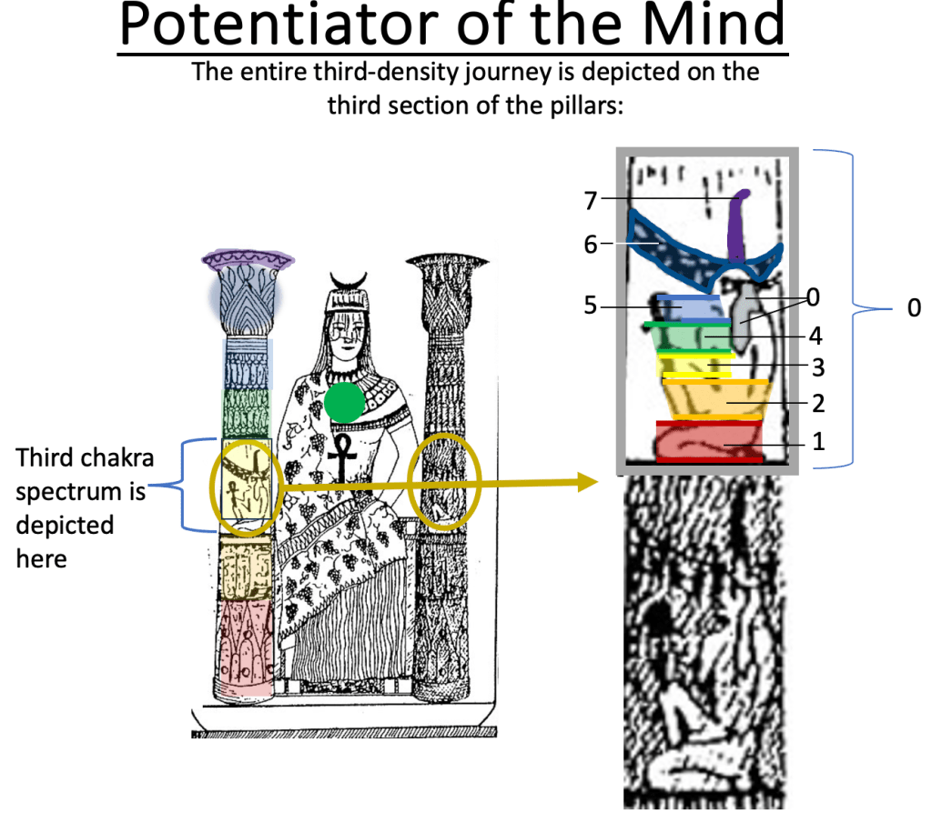 3: Right arm holding ankh at the yellow-ray center and right hand resting on right bended knee, both indicating agency of the self-conscious yellow-ray entity. Right knee is bent at the yellow-ray center indicating the potential to exercise agency to stand and move–a yellow-ray entity’s capacity to self-direct given emergence of self-consciousness.