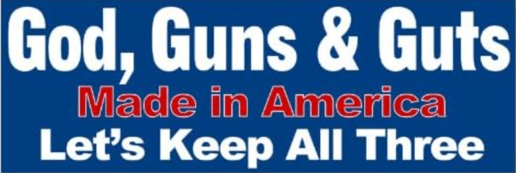 God, I saw, these are some, these are some stickers on the back of big trucks that I saw, and it was God, guns, and grit.