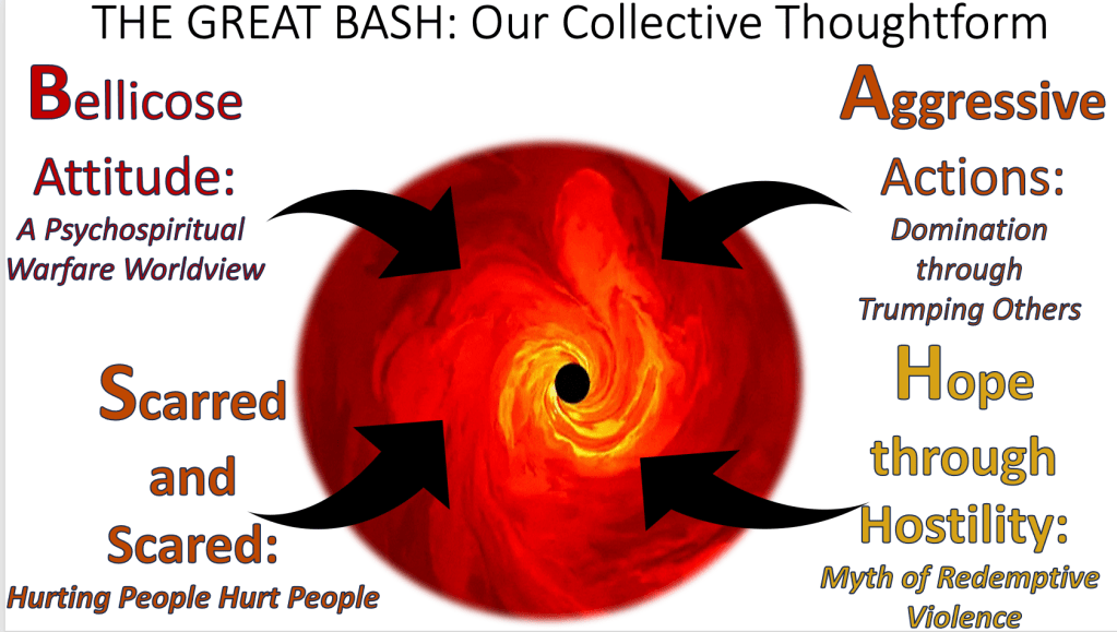 - The Collective Thoughtform of Bellicosity, or what Doug calls, “The Great BASH,” is a type of psychospirital sentient being that was created, and has been nourished, by Earth’s 3rd Density spacetime planetary entity, whose consciousness membrane is the noosphere.