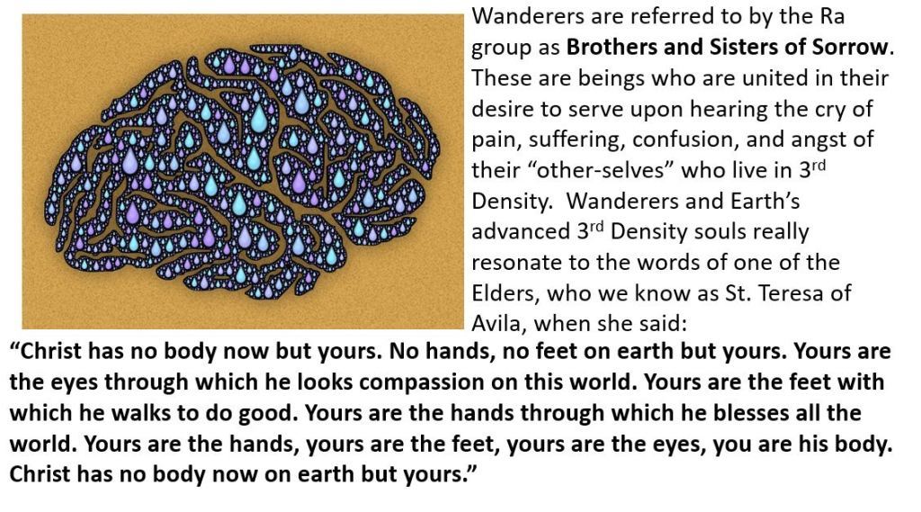 “Imagine, if you will, the sands of your shores. As countless as the grains of sand are the sources of intelligent infinity. When a social memory complex has achieved its complete understanding of its desire, it may conclude that its desire is service to others with the distortion towards reaching their hand, figuratively, to any entities who call for aid. These entities whom you may call the Brothers and Sisters of Sorrow move towards this calling of sorrow. These entities are from all reaches of the infinite creation and are bound together by the desire to serve in this distortion.”¹