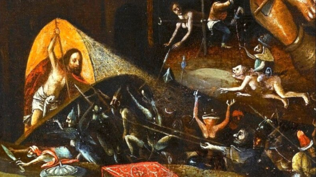 In mystical Christianity, the Harrowing of Hell refers to the “Vigil of the Heart of the Earth”—the liminal space between tragedy and triumph during Holy Saturday when Jesus descended into the heart of the earth to encounter the depths of separation and disintegration. According to Cynthia Bourgeault in The Wisdom Jesus, when Jesus entered the realms of the dead, he didn’t fix, judge, or redeem hell itself. Instead, “he just sat there surrounded by the darkest, deepest, most alienated, most constricted states of pained consciousness; sitting, if we can imagine it, among all those mirroring faces of the collective false self… sitting there in the midst of blackness.” His love went into the darkest and deepest places of darkness and reconnected the darkness to the whole.