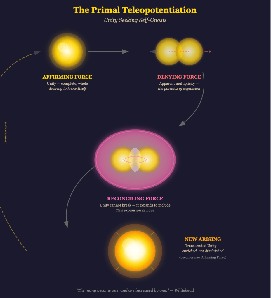 I use “teleopotentiation” because the term emphasizes that this process is telic (goal-directed) and potentiating (actualizing latent potential). Creation does not drift toward entropy but advances toward ever-greater intensity of experience through perpetual resolution of tensions into novel harmonies. The term captures this sacred spiral.