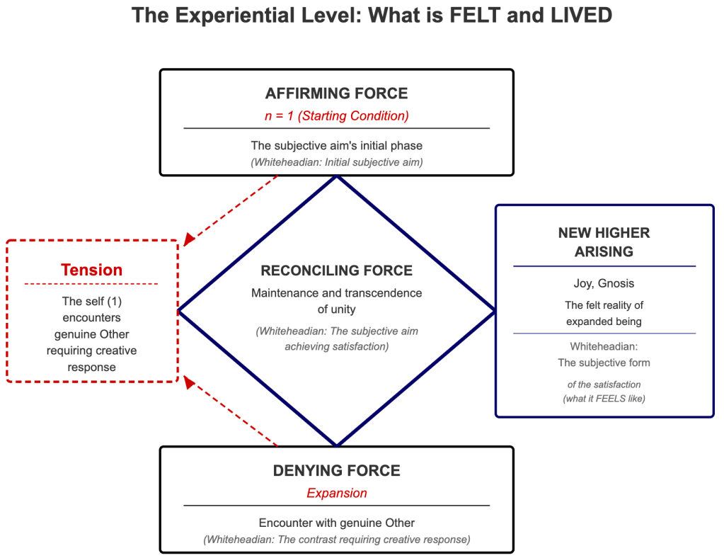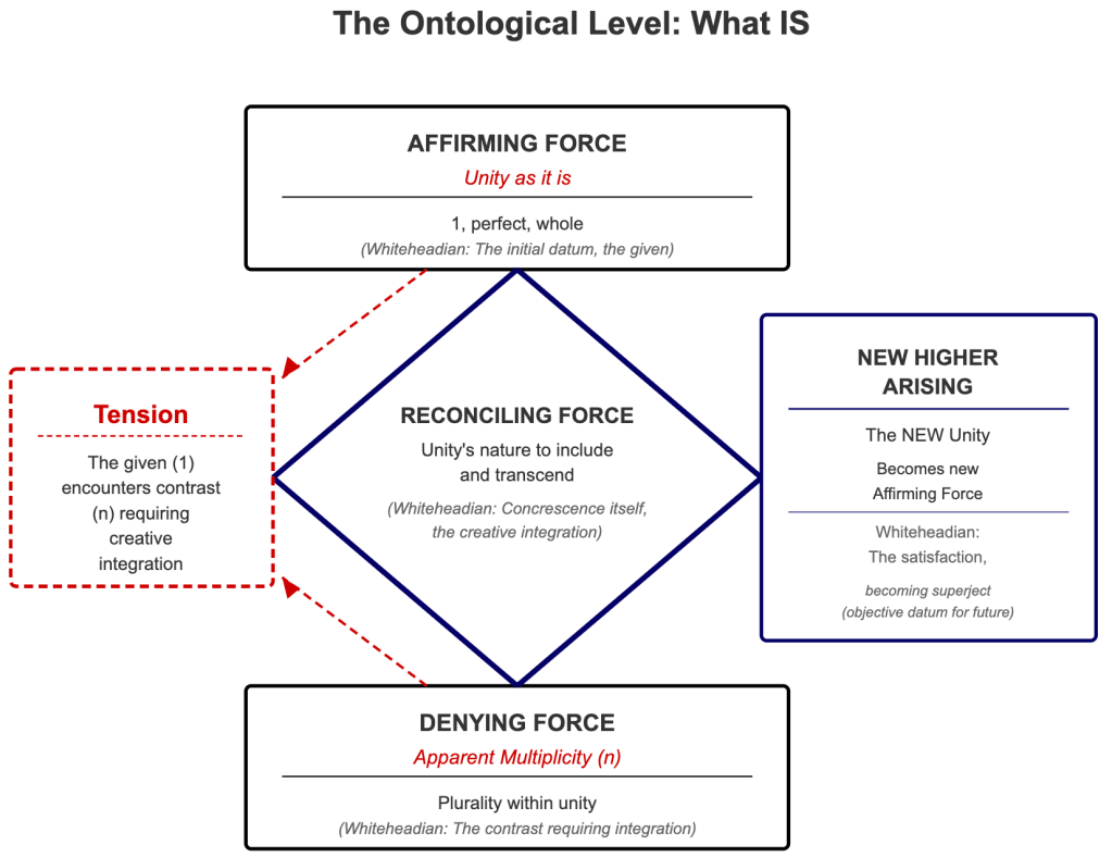 The New Arising is unity transformed: not the original undifferentiated One, but Unity-that-has-known-itself-through-apparent-Other. Whitehead captures this precisely: “The many become one, and are increased by one.” The process enriches rather than diminishes.