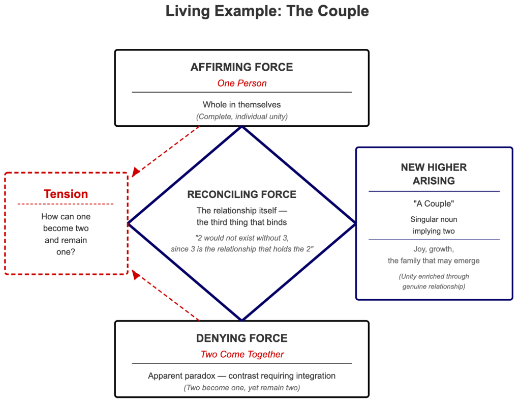 - Apparent multiplicity (n unified entities) serves as the Denying Force — stretching unity to creative tension