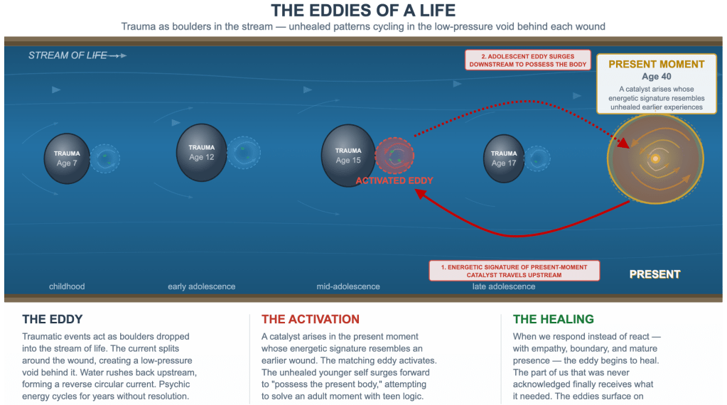 Years later, sometimes decades later, when something in our present environment carries an energetic signature that resembles the original wound, the old eddy activates. The unhealed version of ourselves — the 12-year-old, the 15-year-old, the 17-year-old — rises up and tries to handle a complex adult situation using the limited logic available to a teenager. The earlier self, as I describe it in my clinical work, possesses the present body and attempts to make sense of the moment from the perspective of someone who never had the tools to process what happened the first time around.