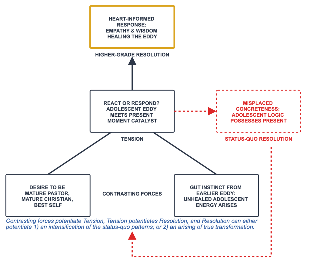 Start at the bottom. The two boxes at the lower portion of the image represent the contrasting forces. On one side: the desire to be a mature person — a mature parent, partner, professional, or human being. On the other side: the gut instinct from the activated adolescent eddy — the unhealed energy that arises when a present-moment catalyst resembles an old wound. These two forces are not ranked. Neither is superior. They are the raw material of transformation.