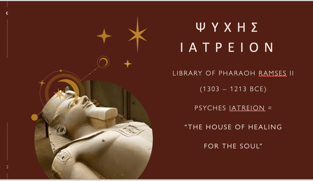 Tim introduced an inscription recorded by the Greek historian Diodorus Siculus, who lived during the age of Caesar. This inscription was found in the tomb complex of Ramses II — the Ramesseum — in what Diodorus identified as the world’s oldest known library, predating the Library of Alexandria. The Greek reads Psyches Iatreion, which translates: “The House of Healing for the Soul.”