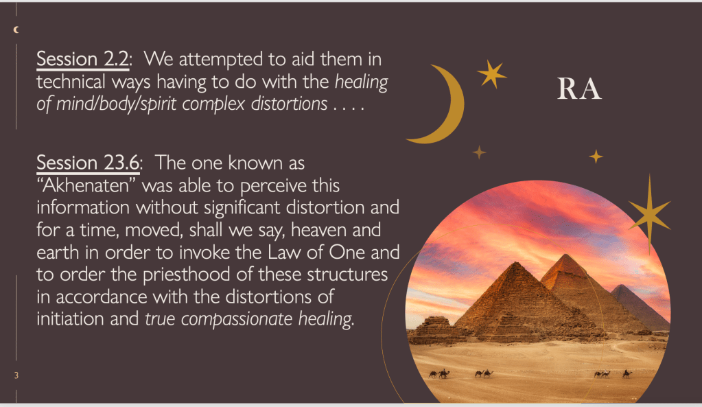 The slide presented two key Ra passages. From Session 2.2: “We attempted to aid them in technical ways having to do with the healing of mind/body/spirit complex distortions.” And from Session 23.6: “The one known as ‘Akhenaten’ was able to perceive this information without significant distortion and for a time, moved, shall we say, heaven and earth in order to invoke the Law of One and to order the priesthood of these structures in accordance with the distortions of initiation and true compassionate healing.”