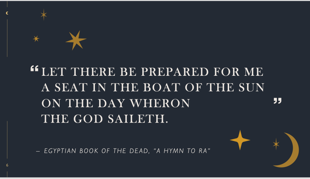 Tim read the hymn: “Let there be prepared for me a seat in the boat of the Sun, on the day whereon the god saileth.”