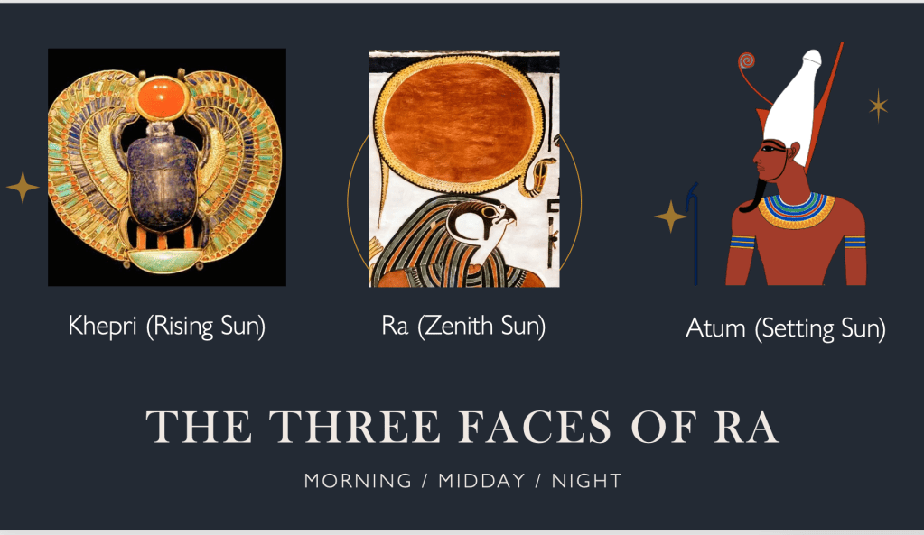 (Three images side by side: the winged scarab beetle jewel [Khepri, Rising Sun]; the falcon-headed sun disc [Ra, Zenith Sun]; and Atum in human form wearing the double crown [Setting Sun])