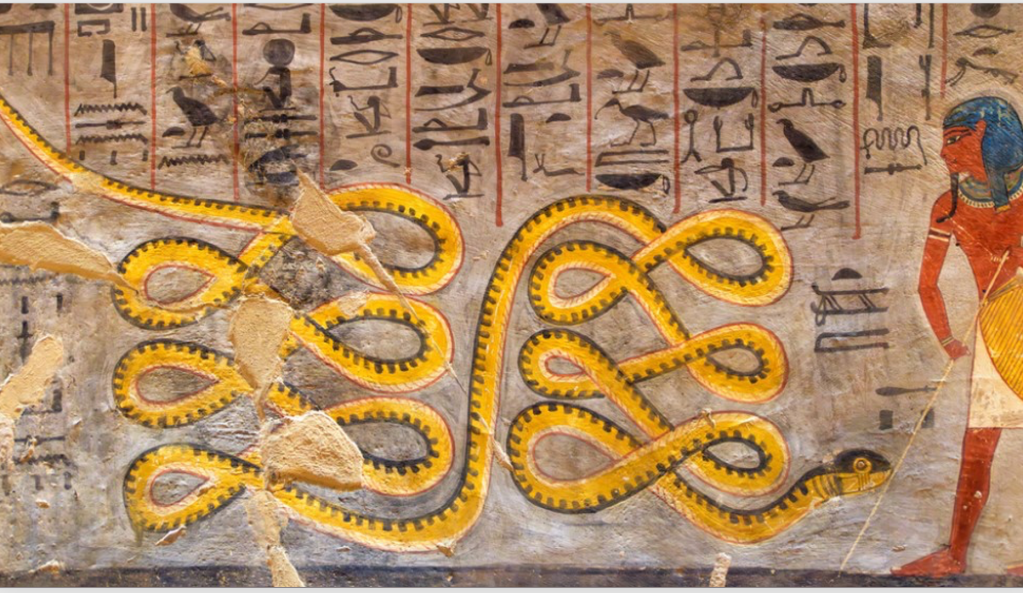 (Tomb wall painting: Atum-Ra stands with a weapon while Apep writhes in massive golden coils of infinity-loops before him, hieroglyphic text above)