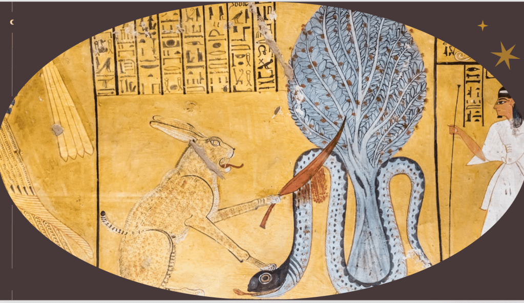 (Egyptian Book of the Dead, Spell 17: the great cat Mau, a manifestation of Ra, holds a blade and confronts Apep, who coils around the trunk of the Tree of Life)