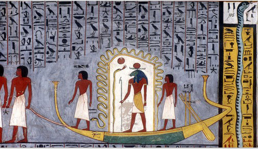 (Tomb wall painting: Ra in his beetle form stands in a shrine of light aboard his barge, attended by figures — but Apophis, depicted as a golden serpent, boxes the light in on all sides)