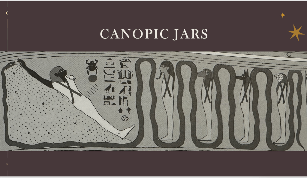 Tim explained that when the Egyptians prepared bodies for burial, the organs were placed in four canopic jars, each associated with one of the four elements. “Do you notice how the Egyptians drew Apep going around every single jar?” he asked.