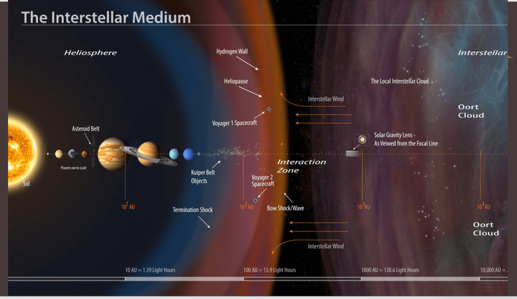 (Scientific diagram of the heliosphere, showing the sun, the planets nested within its protective torus, the heliopause, and interstellar space beyond)